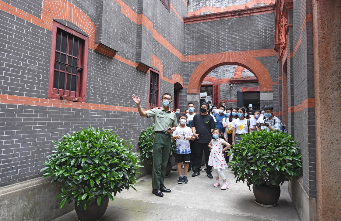 武警上海總隊執(zhí)勤第四支隊執(zhí)勤十中隊義務講解員在中共一大紀念館向游客講黨史(2020年6月20日攝)。