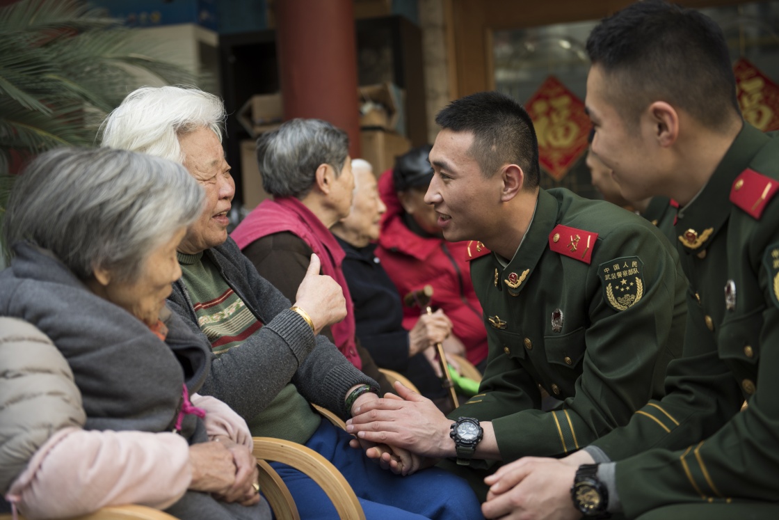 武警上??傟爤?zhí)勤第四支隊執(zhí)勤十中隊官兵在黃浦區(qū)老年公寓看望老人(2018年3月30日攝)。