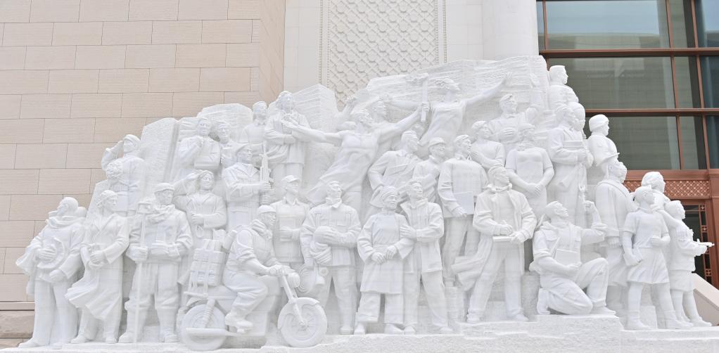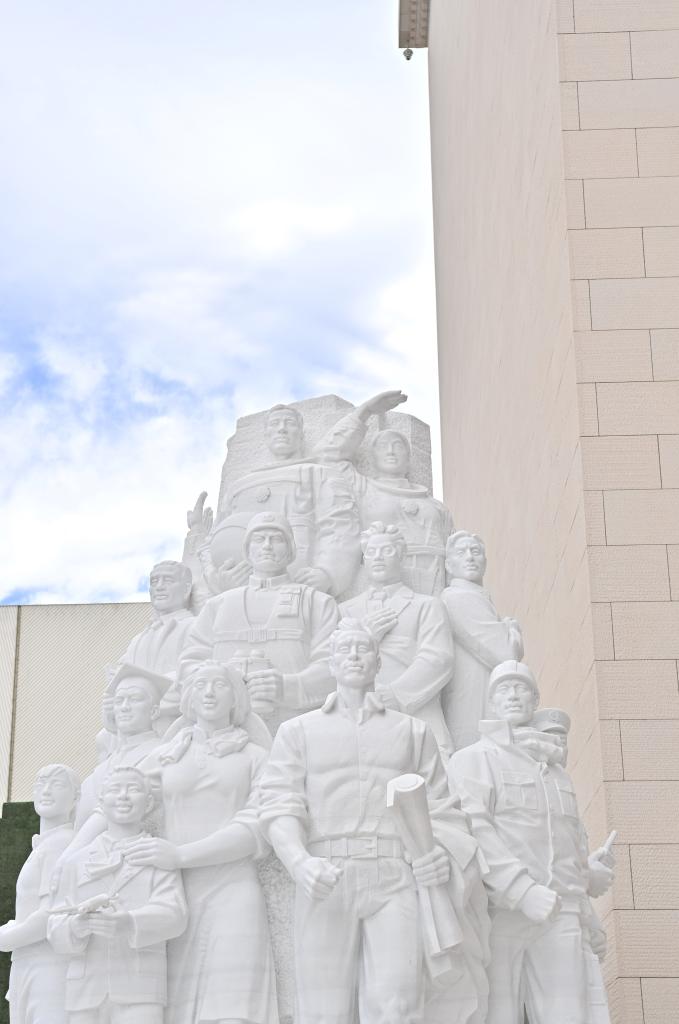 細節(jié)一:人物場景揭示新時代成就。雕塑前端正面人物形象是黨員干部、大國工匠、農(nóng)民、軍人代表、知識分子、企業(yè)家和宇航員等。整個雕塑共塑造人物65位,涵蓋不同群體、不同職業(yè),大學(xué)生村官、援外維和、建設(shè)綠水青山等凸顯新時代成就。