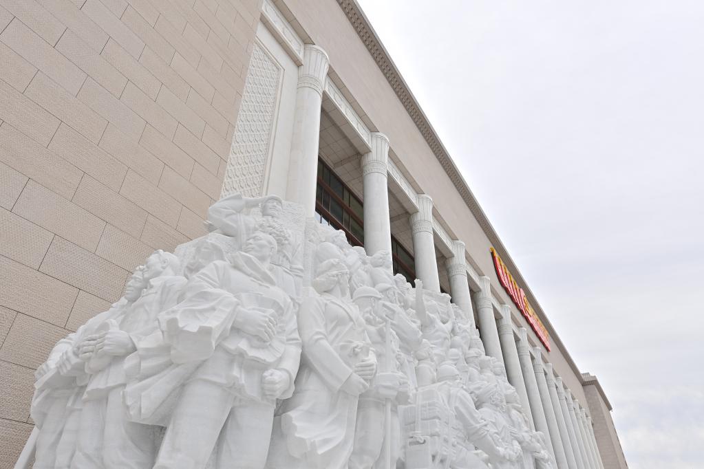 細節(jié)二:藝術(shù)化勾連歷史與現(xiàn)實。整個雕塑既是統(tǒng)一的整體,又含蓄地分成兩個段落。中間通過“火炬”和“旗幟”的形象進行連接和升華,突出了偉大事業(yè)“薪火相傳”“接力奮斗”的深層意象。