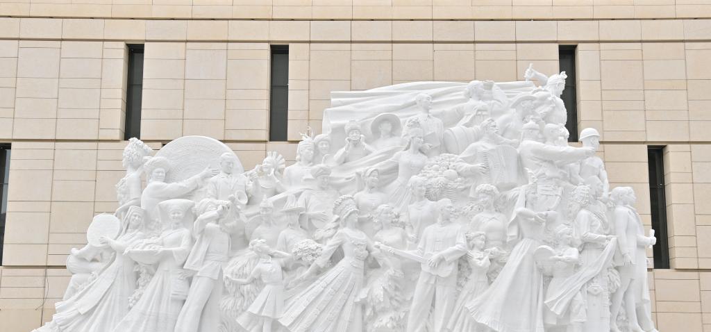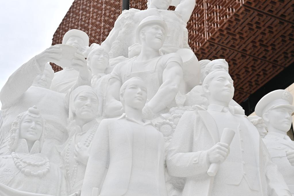 細(xì)節(jié)一:73位人物形象團(tuán)結(jié)一致。雕塑以“團(tuán)塊結(jié)構(gòu)”作為主體造型語言,73位人物形象融入主體之中,形成團(tuán)結(jié)一致、闊步前行的恢宏陣勢,塑造了農(nóng)民、工人、新經(jīng)濟(jì)工作者、黨政干部、知識分子和軍人形象,各民族的人物形象將生活場景、民族風(fēng)情進(jìn)行了詩意化的表現(xiàn)。
