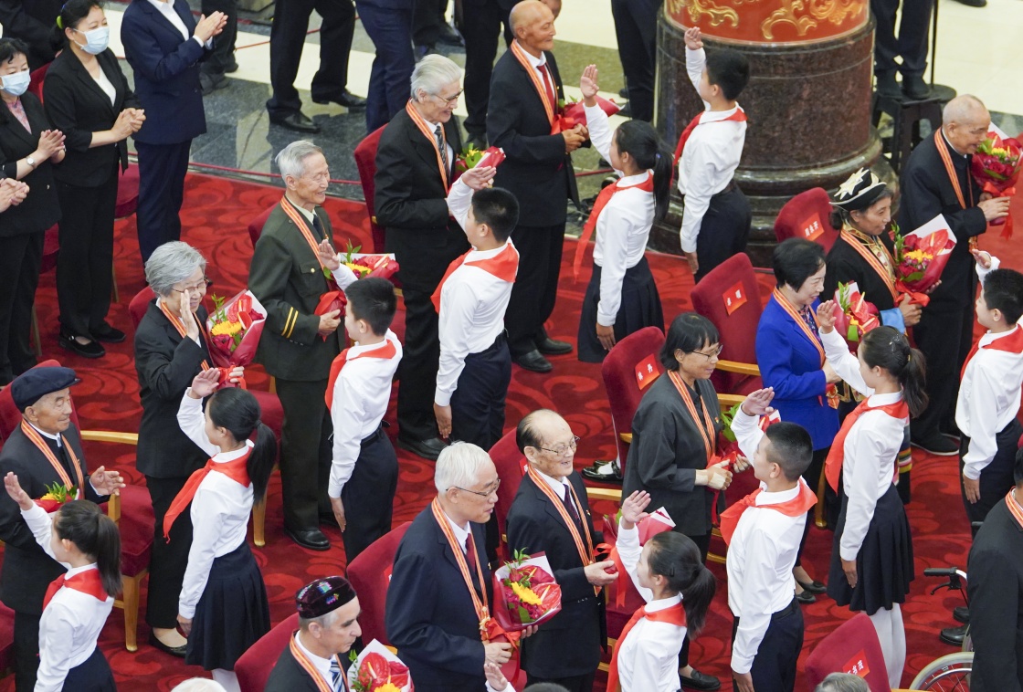 6月29日,慶祝中國共產(chǎn)黨成立100周年“七一勛章”頒授儀式在北京人民大會堂金色大廳隆重舉行。這是少先隊員向勛章獲得者獻花,敬禮致意。