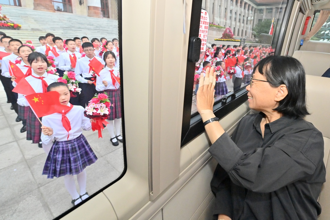 6月29日,慶祝中國(guó)共產(chǎn)黨成立100周年“七一勛章”頒授儀式在北京人民大會(huì)堂金色大廳隆重舉行。這是“七一勛章”獲得者張桂梅向青少年致意。