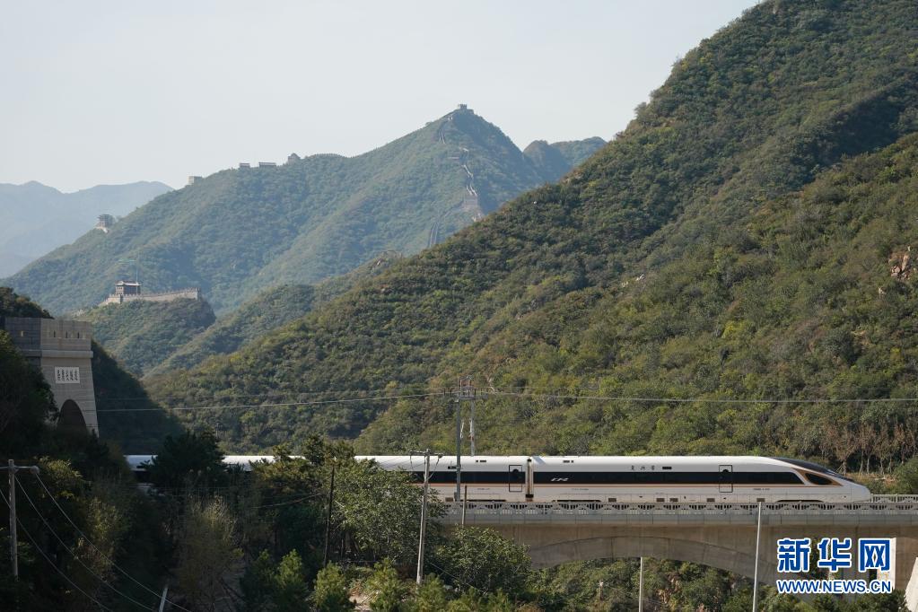 一列復(fù)興號高鐵列車從京張高鐵駛過居庸關(guān)長城(2020年10月6日攝)。新華社記者 鞠煥宗 攝