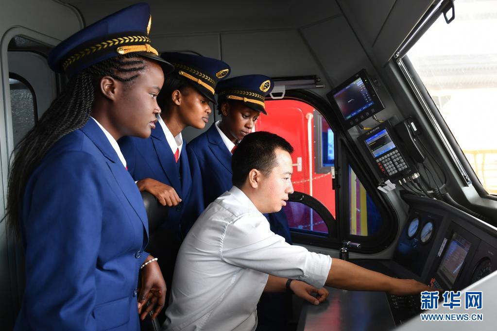 在肯尼亞內(nèi)羅畢,肯尼亞火車司機(jī)跟隨中國老師張程熟悉操作流程(2017年5月17日攝)。新華社記者 孫瑞博 攝