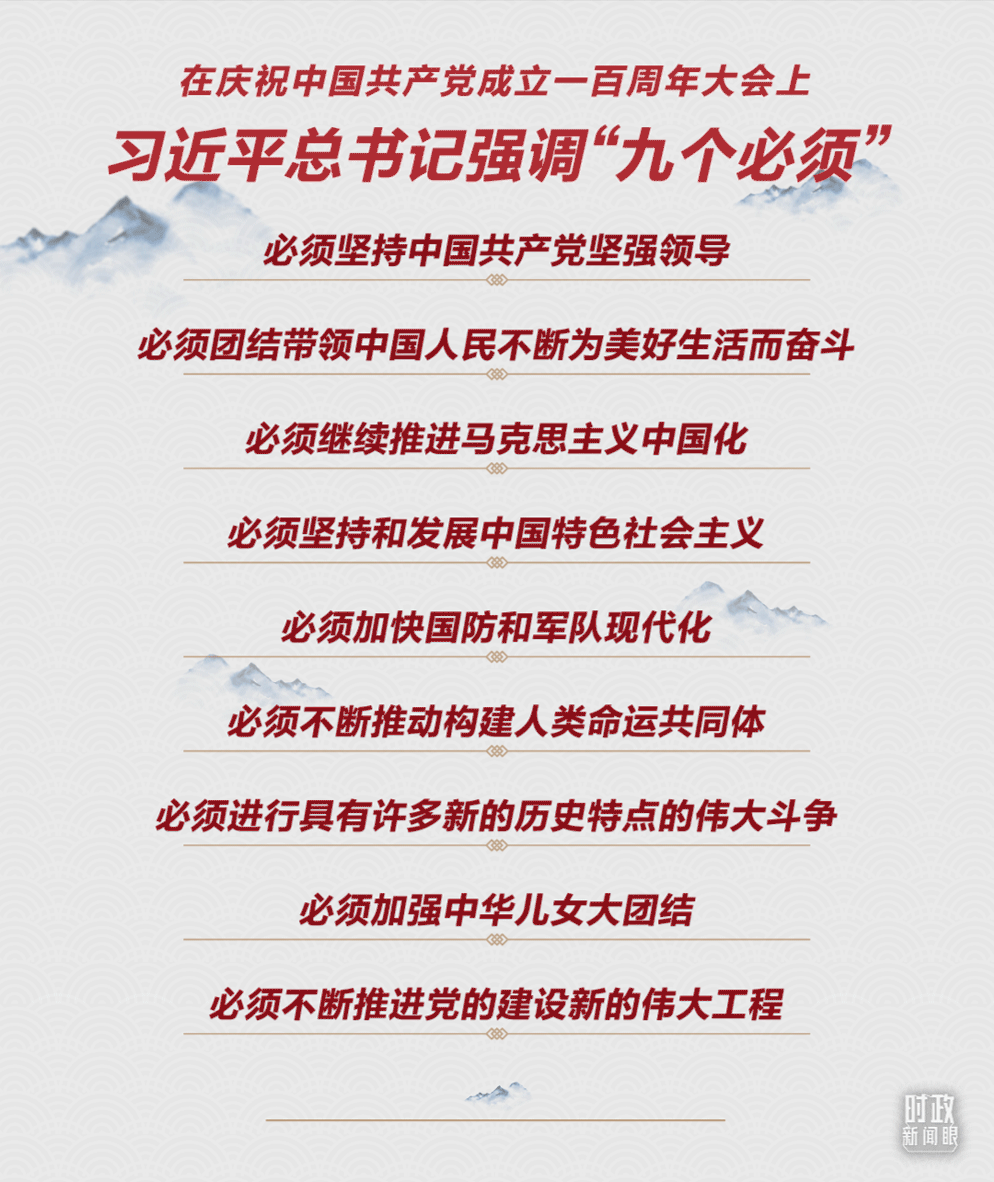 在7月1日的慶祝中國共產(chǎn)黨成立100周年大會上,習近平強調(diào),我們要用歷史映照現(xiàn)實、遠觀未來,從中國共產(chǎn)黨的百年奮斗中看清楚過去我們?yōu)槭裁茨軌虺晒Α⑴靼孜磥砦覀冊鯓硬拍芾^續(xù)成功。以史為鑒、開創(chuàng)未來,總書記提出“九個必須”,并作出許多新論斷、新表述。