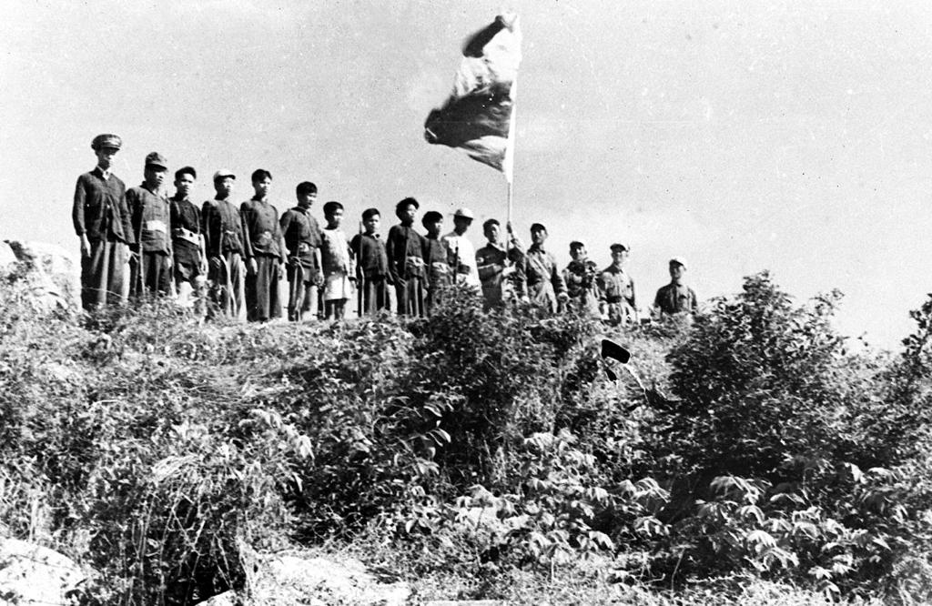 ↑這是1950年我人民解放軍和瓊崖縱隊會師在五指山上(資料照片)。新華社發(fā)
