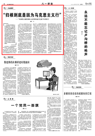 “任何真正的哲學都是自己時代精神的精華?!绷暯叫聲r代中國特色社會主義思想,是馬克思主義中國化的最新成果,是當代中國的馬克思主義、21世紀的馬克思主義,是全黨全國人民為實現(xiàn)中華民族偉大復興而奮斗的行動指南,是黨和國家必須長期堅持的指導思想。習近平強軍思想是以習近平同志為核心的黨中央,在波瀾壯闊的強軍實踐中,帶領全軍深入進行理論探索和實踐創(chuàng)造形成的,實現(xiàn)了馬克思主義軍事理論中國化時代化新飛躍,開拓了當代中國馬克思主義軍事理論和軍事實踐新境界。