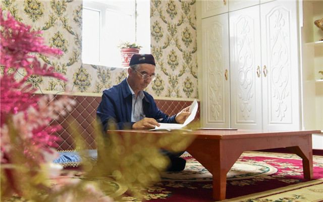 在新疆伊寧縣溫亞爾鎮(zhèn)布力開村,買買提江·吾買爾在家學(xué)習(xí)(6月12日攝)。新華社記者 丁磊 攝