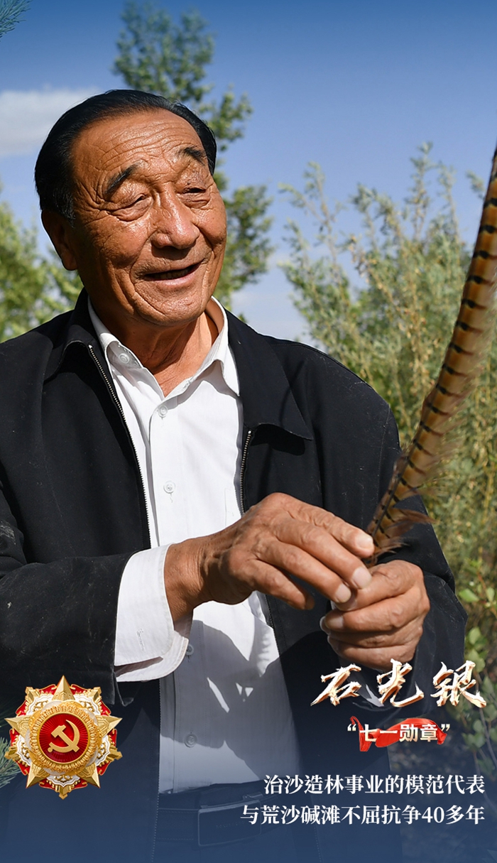 “石光銀,治沙造林事業(yè)的模范代表,40多年堅(jiān)持與荒沙堿灘不屈抗?fàn)?,?chuàng)造治沙與致富相結(jié)合的新模式,為徹底改變毛烏素沙漠南緣‘沙進(jìn)人退’惡劣環(huán)境作出杰出貢獻(xiàn)。”這簡(jiǎn)短的出場(chǎng)介紹,讓更多的人記住了這副寬厚的肩膀扛起來的不凡事業(yè),也為“治沙人”的故事寫下梗概。