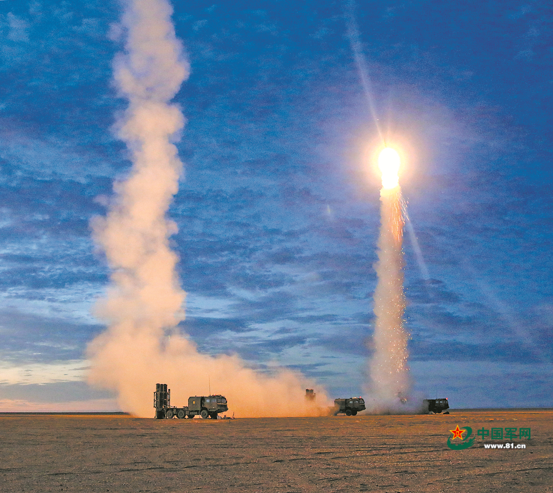 “發(fā)射!”隨著指揮員一聲令下,多枚導(dǎo)彈直刺蒼穹,撲向“敵”目標(biāo)。