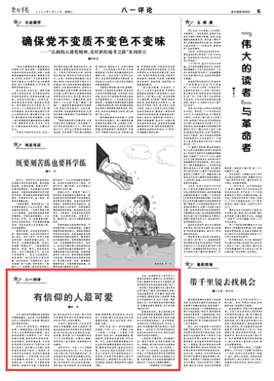 尤其令人感動的是,15位老黨員有的已年逾耄耋,有的已值鮐背,曾經為我黨我軍的革命事業(yè)作出卓越貢獻,如今依然以時不我待的緊迫感、使命感、責任感,以十足的精氣神在盡心盡力發(fā)揮余熱。不禁令人感慨,有信仰的人是可愛的,是經得起歲月洗練的。