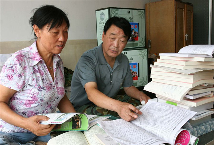這是張連印和妻子一起查閱資料,學習植樹造林和防風治沙知識(2007年9月1日攝)。新華社 劉松峰攝