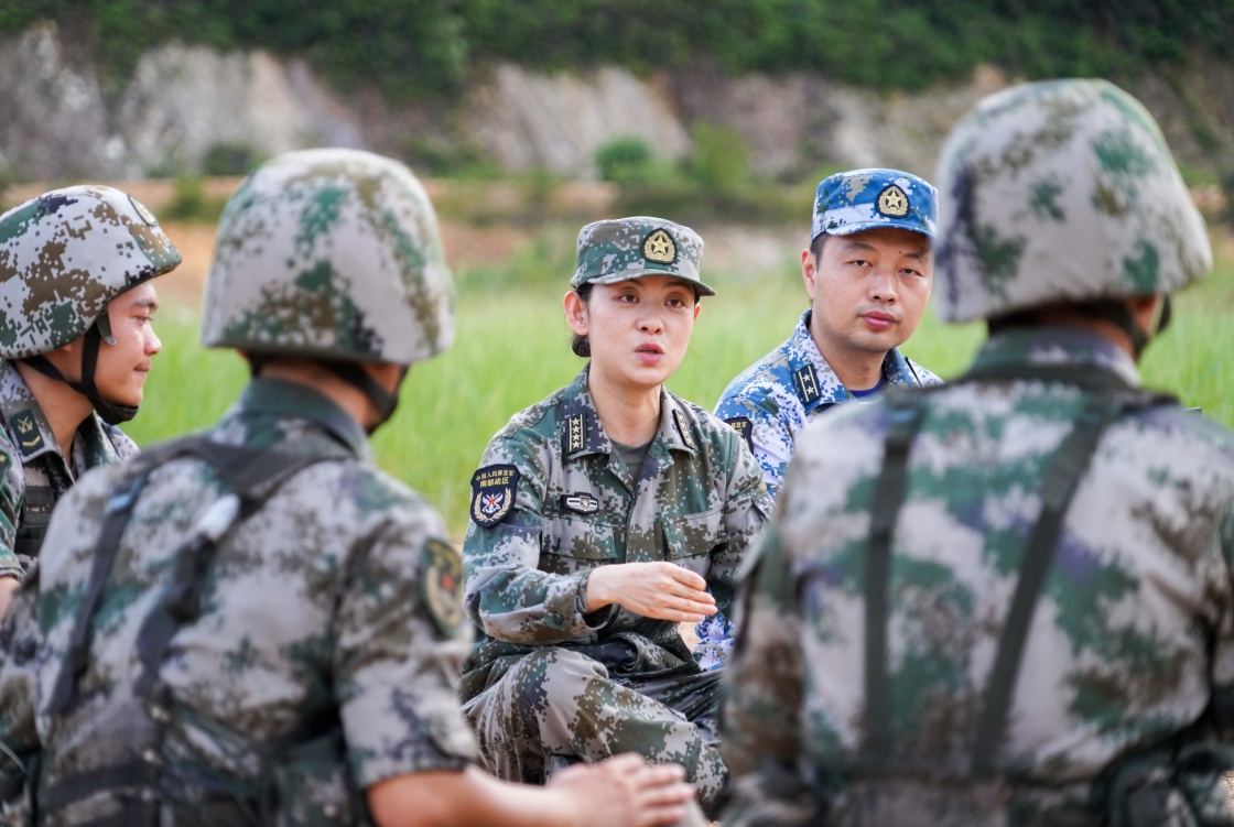 喬莎莎(中)在訓(xùn)練間隙與基層官兵探討交流(7月6日攝)。新華社發(fā)(欒鋮 攝)
