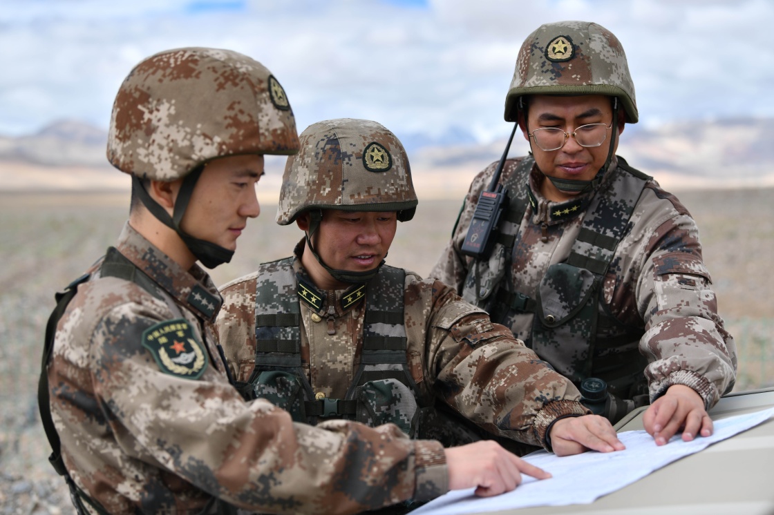 曾文龍(中)與高原部隊(duì)官兵一同勘察陣地(7月22日攝)。新華社發(fā)(吳哲鋒 攝)