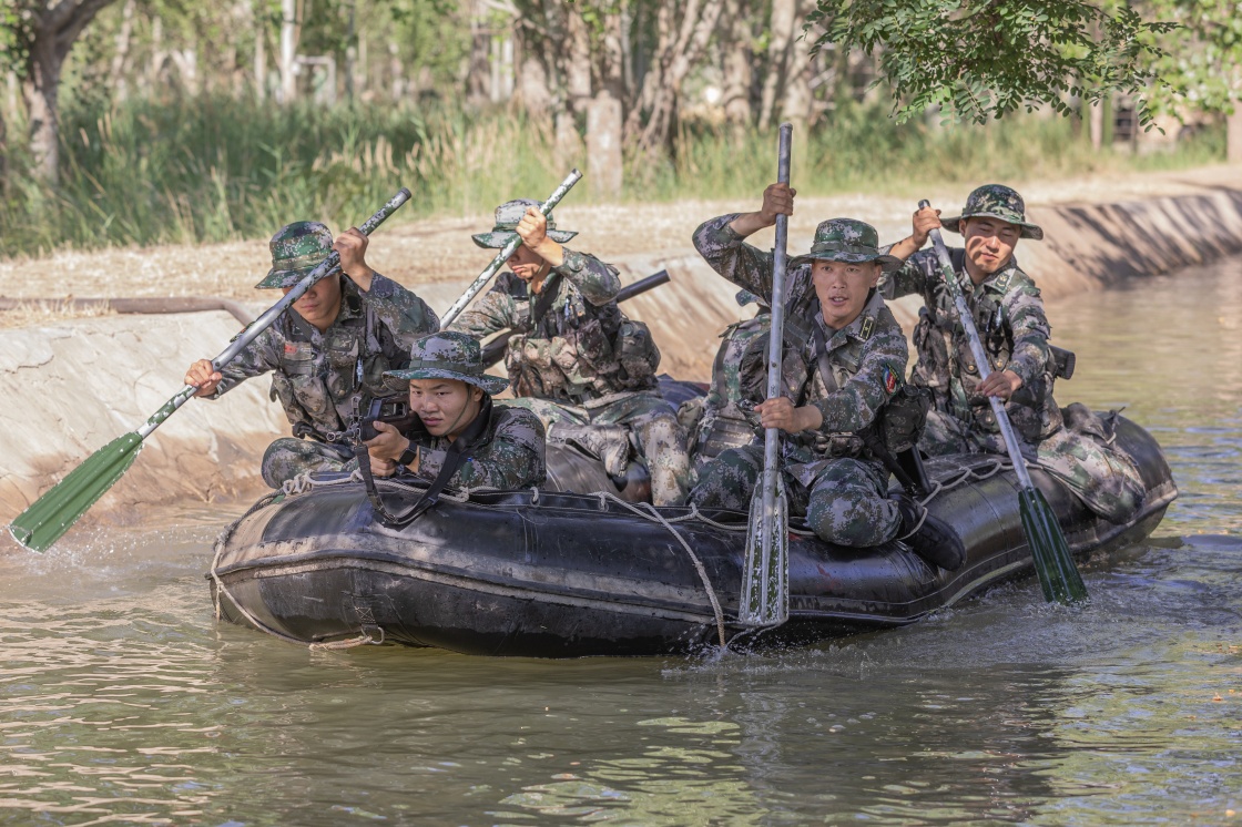 陸軍第76集團(tuán)軍某特戰(zhàn)旅特戰(zhàn)營(yíng)營(yíng)長(zhǎng)劉近(右二)帶領(lǐng)特戰(zhàn)小隊(duì)武裝泅渡(7月9日攝)。新華社發(fā)(陳浩 攝)