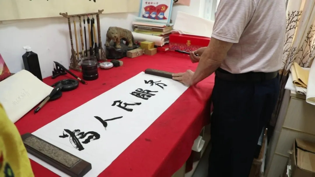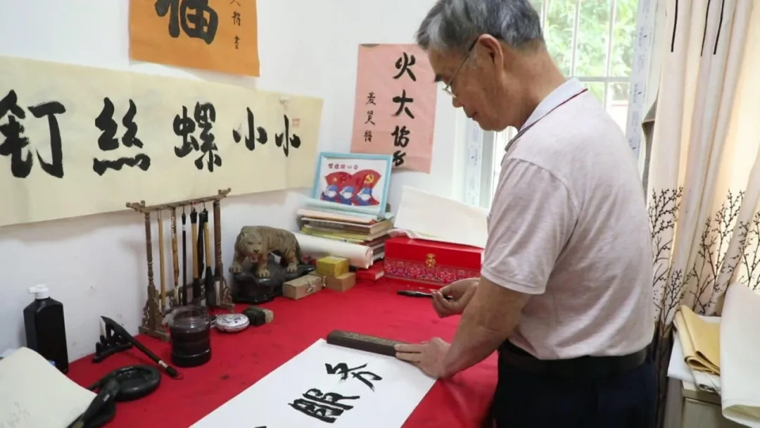 在閑暇的時(shí)間里,麥賢得喜歡練書(shū)法,老人寫(xiě)得最多的就是“為人民服務(wù)”,而“永作小小螺絲釘”則是他最喜歡的一句話(huà),一直擺在案頭勉勵(lì)自己。