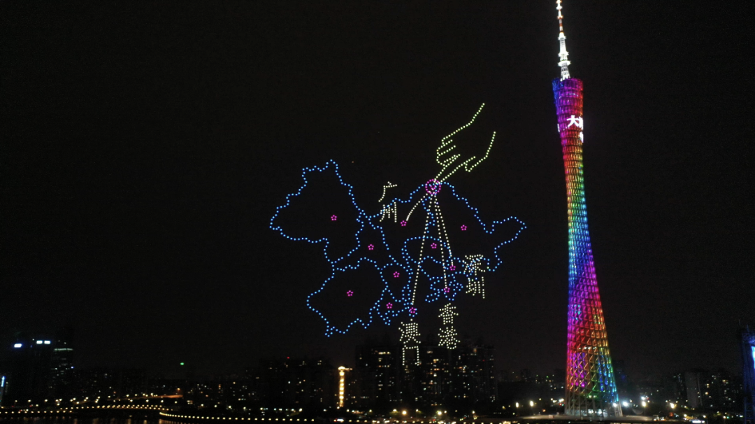 △一千架無人機(jī)劃破夜空,在廣州的天幕上組成“大灣區(qū)大未來”的字樣,隨后又以精確的定位擺出粵港澳大灣區(qū)地圖。