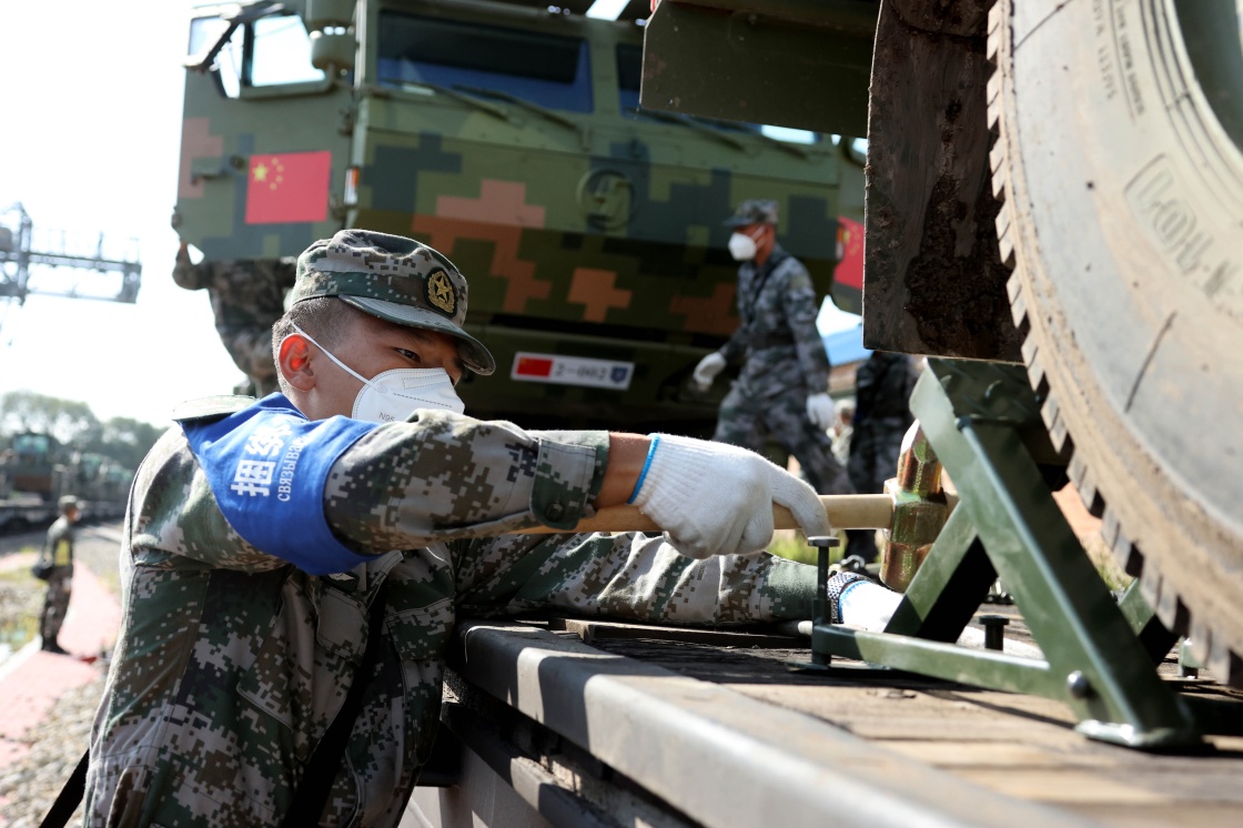 參加“和平使命-2021”聯(lián)合軍演的中方參演部隊官兵對鐵運裝備進行加固(8月22日攝)。新華社發(fā)(仲崇嶺 攝)