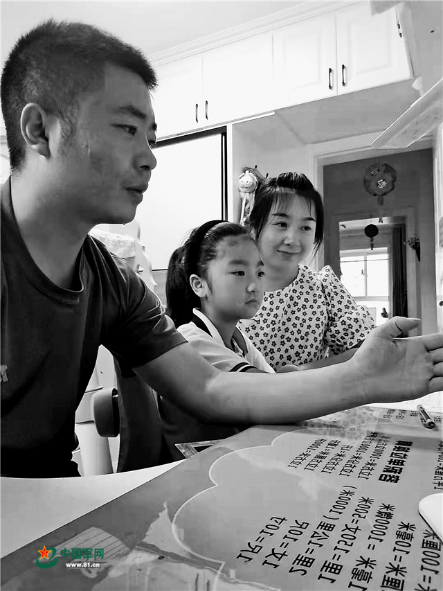 初識(shí)“兵爸爸”陳鵬,張妙佳才8歲。時(shí)光轉(zhuǎn)瞬即逝,陳鵬作為張敬剛的好戰(zhàn)友,也漸漸成為小妙佳最信任的人之一。在陳鵬帶動(dòng)下,上士楊東東、王祥武、下士王永強(qiáng)等9名戰(zhàn)友也成了小妙佳的“兵爸爸”。每當(dāng)張敬剛外出執(zhí)行任務(wù),給小妙佳輔導(dǎo)作業(yè)就成了這10名“兵爸爸”的“特殊任務(wù)”。