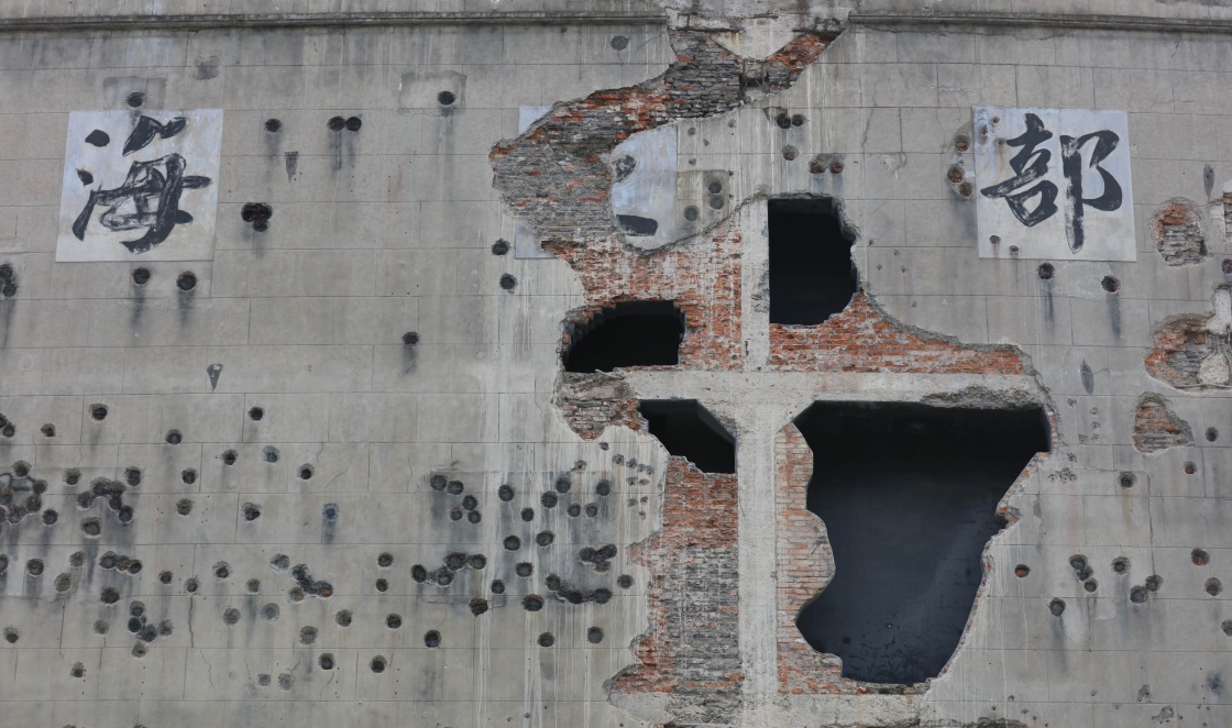 9月17日拍攝的四行倉庫西墻上的炮彈孔和槍彈孔。