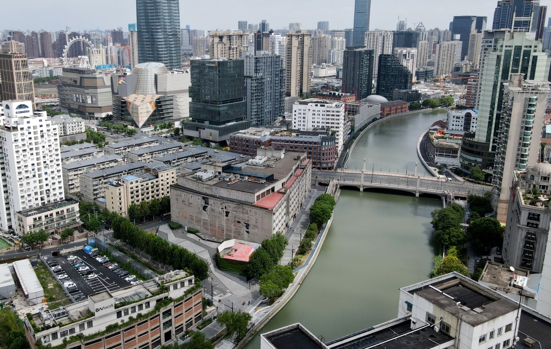 空中俯瞰蘇州河北岸的上海四行倉(cāng)庫(kù)抗戰(zhàn)紀(jì)念館(9月16日攝,無人機(jī)照片)。