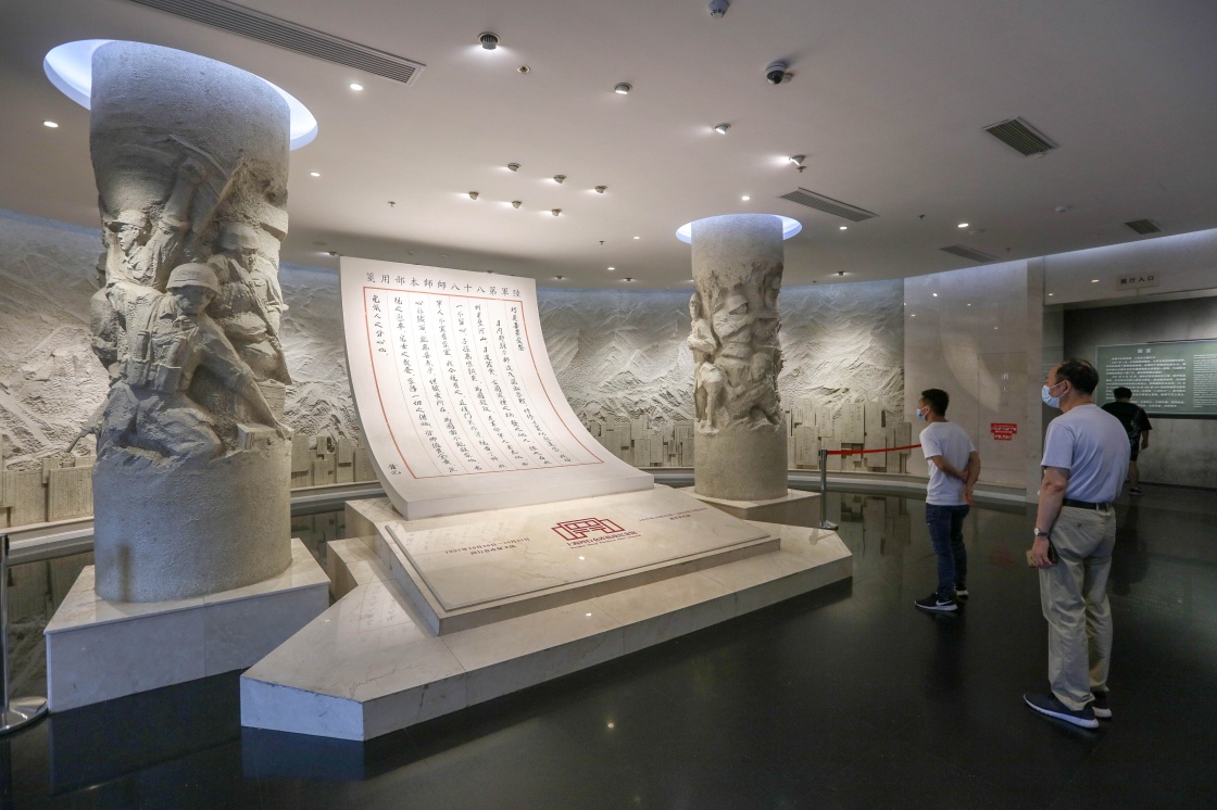 9月16日,人們?cè)谒男袀}(cāng)庫(kù)抗戰(zhàn)紀(jì)念館一樓觀看謝晉元的一封家書。