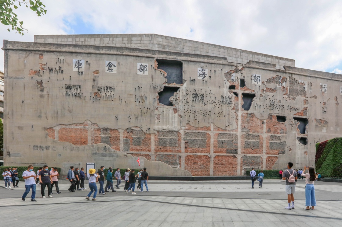 9月17日,人們參觀四行倉(cāng)庫(kù)西墻。