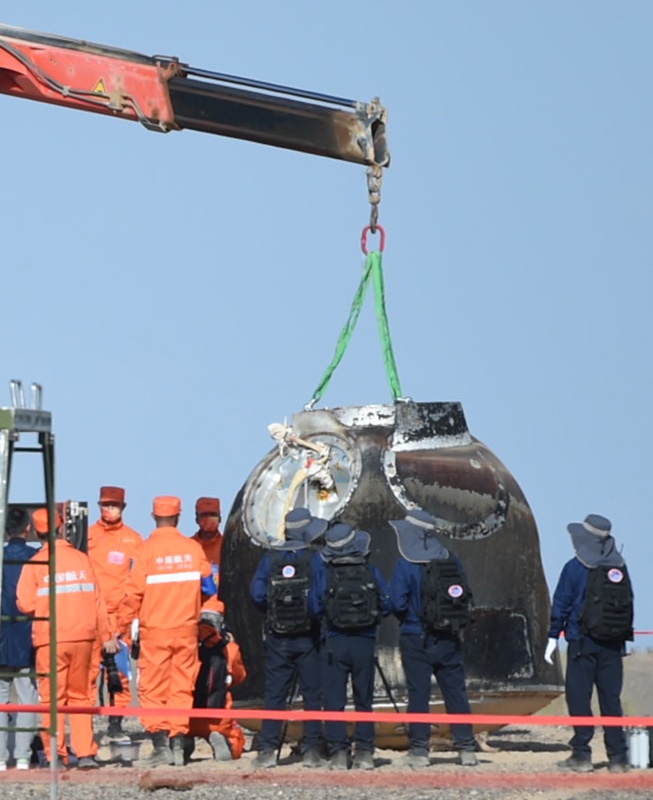 9月17日,工作人員在對返回艙進(jìn)行處置。