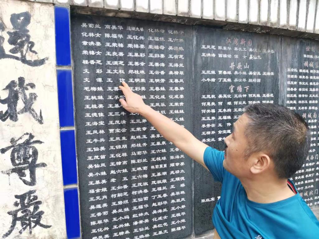 9月8日,義烏市稠江街道崇山村村民王建政指著墻上鼠疫遇難者王仿(王建政叔叔)的名字。新華社記者馮源攝