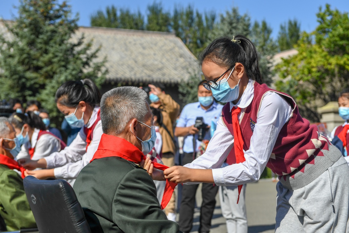 9月18日,少先隊員在紀念儀式上為老兵系上紅領(lǐng)巾。
