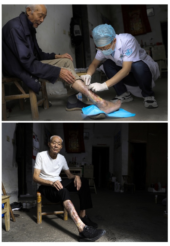 拼版照片:上圖為2020年10月15日,醫(yī)務(wù)人員上門為杜世玉換藥;下圖為2021年9月3日,杜世玉在衢州市衢江區(qū)杜澤村家中。