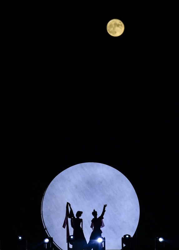 9月21日,在山東棗莊臺兒莊古城,演員與圓月上演“雙月鬧中秋”表演。
