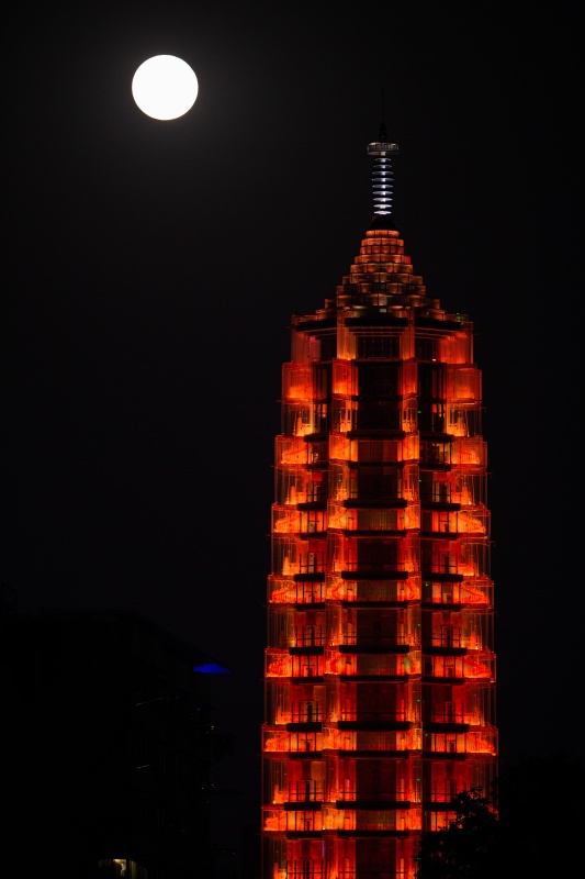 9月21日拍攝的圓月與南京大報(bào)恩塔。