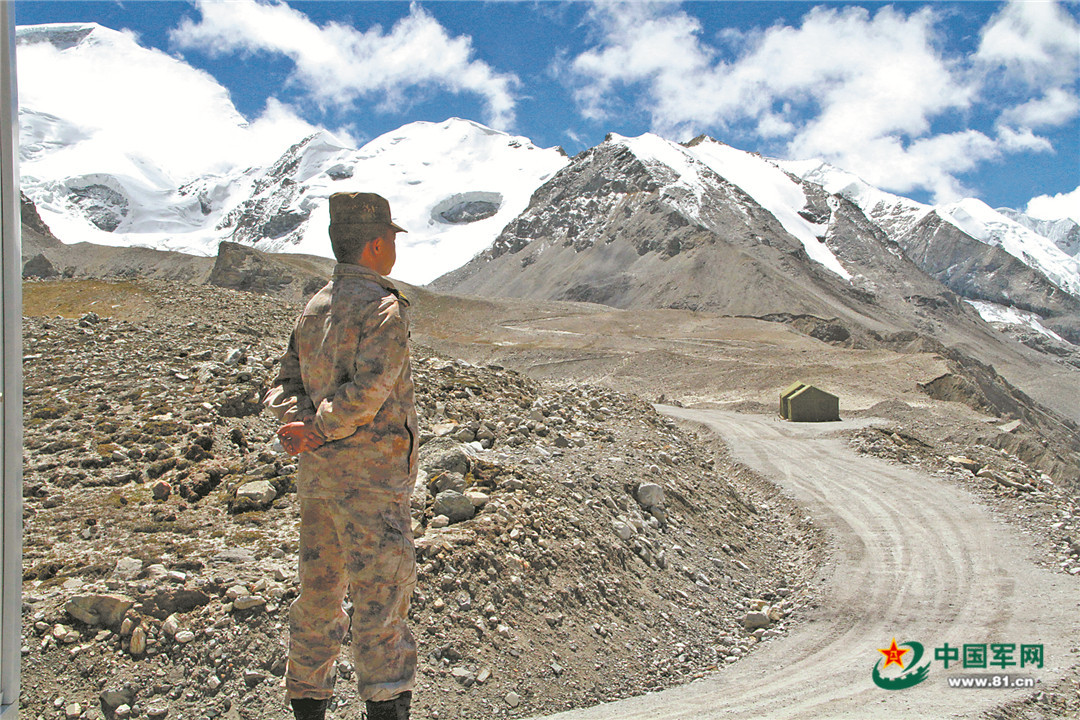 執(zhí)勤崗哨位于一片空地,遠處是連綿雪山,再遠一點的地方便是官兵每天凝視的邊防線。