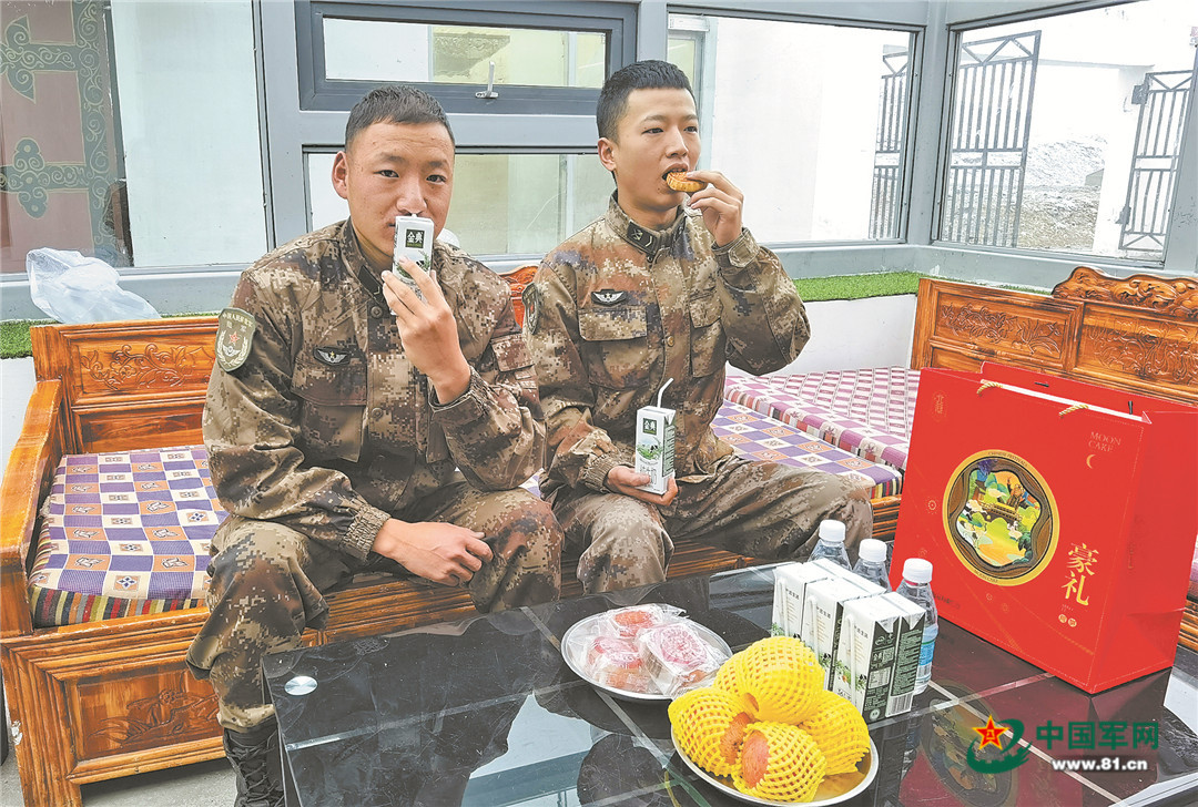 官兵中秋前夕在哨所吃月餅。
