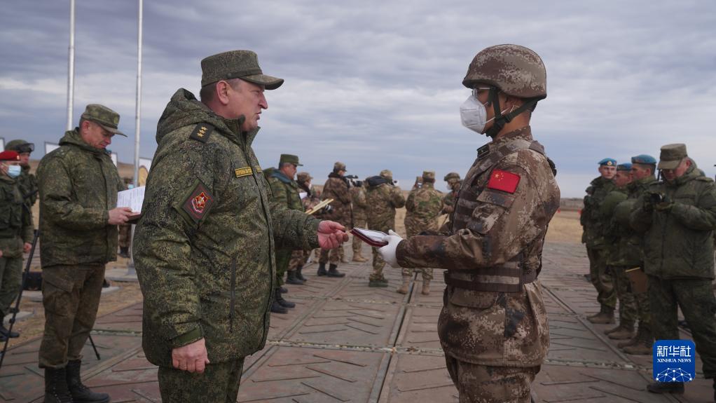 主席臺前,在此次演習中表現(xiàn)突出的各國參演部隊官兵代表分別列隊,接受各國指揮員頒發(fā)的紀念獎?wù)禄颡勂?,中方參演部?7名官兵獲此殊榮。中國軍人在此次演習中展現(xiàn)出的戰(zhàn)斗作風、專業(yè)素質(zhì)和良好形象受到各方高度評價。