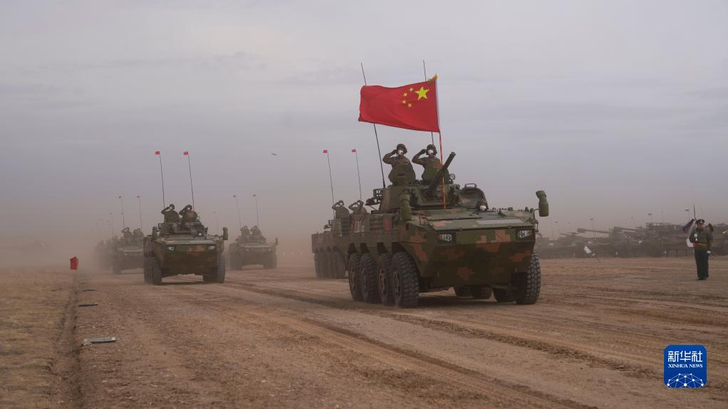 9月24日,在俄羅斯奧倫堡州東古茲靶場(chǎng)舉行的“和平使命-2021”上海合作組織聯(lián)合反恐軍事演習(xí)閉幕式上,中方參演部隊(duì)裝備方隊(duì)接受檢閱。新華社記者梅世雄攝