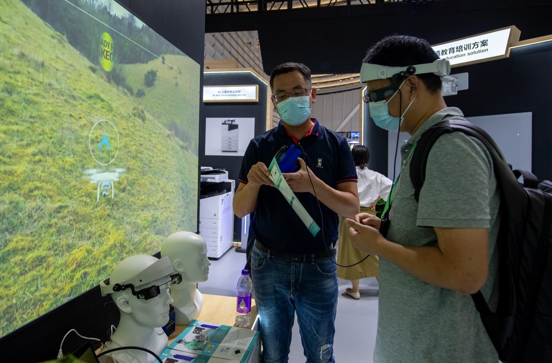 9月25日,在“互聯(lián)網(wǎng)之光”博覽會上,參展商正在向參觀者介紹輕量化AR眼鏡以及其運用場景。人民網(wǎng)記者 翁奇羽攝