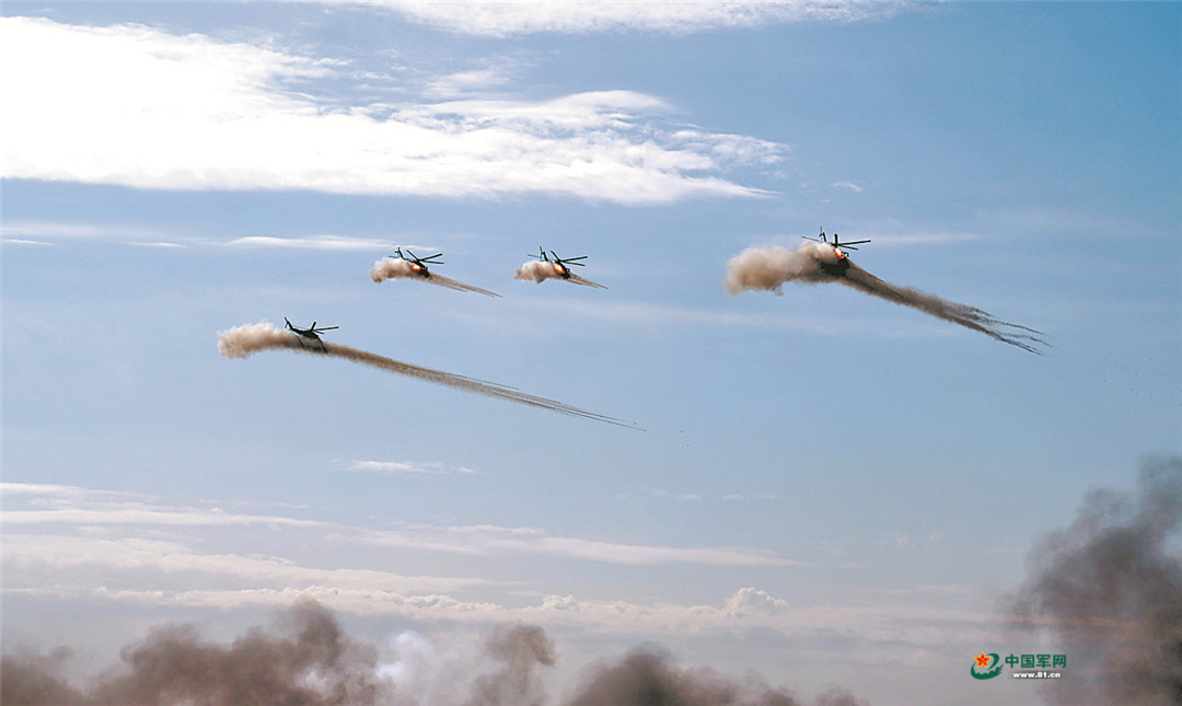 多國聯(lián)合部隊陸航作戰(zhàn)力量對“敵”發(fā)射火箭彈。