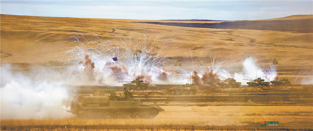 莽莽草原上,一輛輛步戰(zhàn)車、突擊車等輪式裝甲裝備組成的地面突擊隊雷霆出擊,相繼展開戰(zhàn)斗隊形向“敵”縱深發(fā)起猛烈攻勢。多國聯(lián)合部隊展現(xiàn)出強大的火力突擊力,使用空中和地面火力,對“恐怖武裝”實施多波次打擊。伴隨著一陣陣爆炸聲,“敵”陣地火光沖天,濃塵蔽日,一個個目標灰飛煙滅……