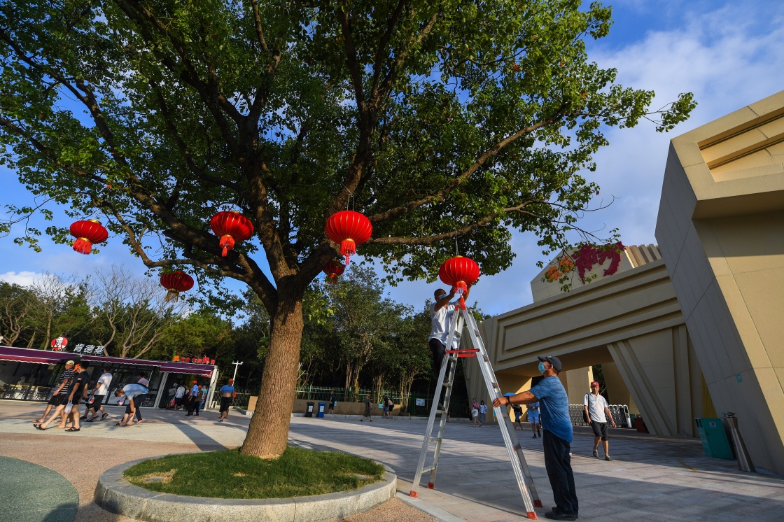 9月26日,朱家尖南沙景區(qū)的工作人員在掛燈籠,為即將到來(lái)的國(guó)慶節(jié)增添喜慶氣氛。