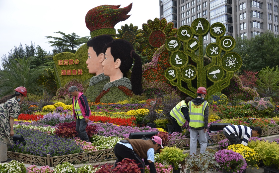 9月25日,園林工人對北京長安街東單路口的主題花壇進(jìn)行最后修飾。