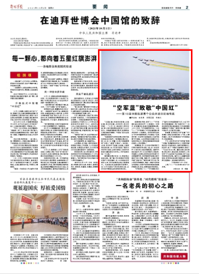 飛行結(jié)束后,“八一”飛行表演隊舉辦了“藍(lán)天儀仗向祖國致敬”儀式,10名飛行員手舉國旗繞場一周?!白鎳f歲!”一位來自深圳的觀眾激動地說,今天在航展現(xiàn)場飄揚的“中國紅”,彰顯中國力量,展現(xiàn)中國志氣,讓大家無比自豪。