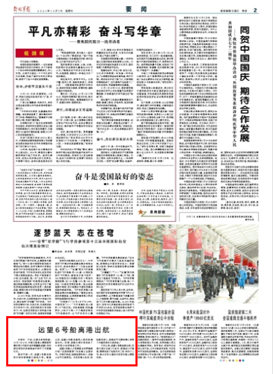 國慶節(jié)前一天,遠望6號船在結(jié)束補給后駛離港口奔赴大洋。離港之后,遠望6號船迅速投入到任務(wù)準備當(dāng)中。目前,該船已按計劃完成了10多類20余項準備工作。