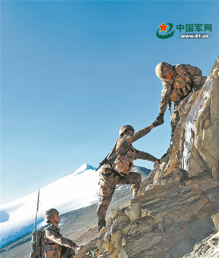 圖①:官兵攀爬陡壁,艱難前行。