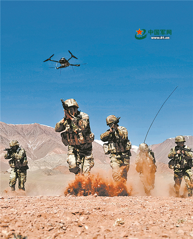 “前方發(fā)現(xiàn)多名不明身份人員,偵察組快速前出偵察,其他人員做好戰(zhàn)斗準(zhǔn)備……”翻過一座雪山后,巡邏小分隊(duì)穿插展開防伏擊戰(zhàn)斗演練。偵察組利用無人機(jī)實(shí)施偵察,迅速報(bào)告相關(guān)情況;火力組借助有利地形,展開圍捕行動(dòng)……