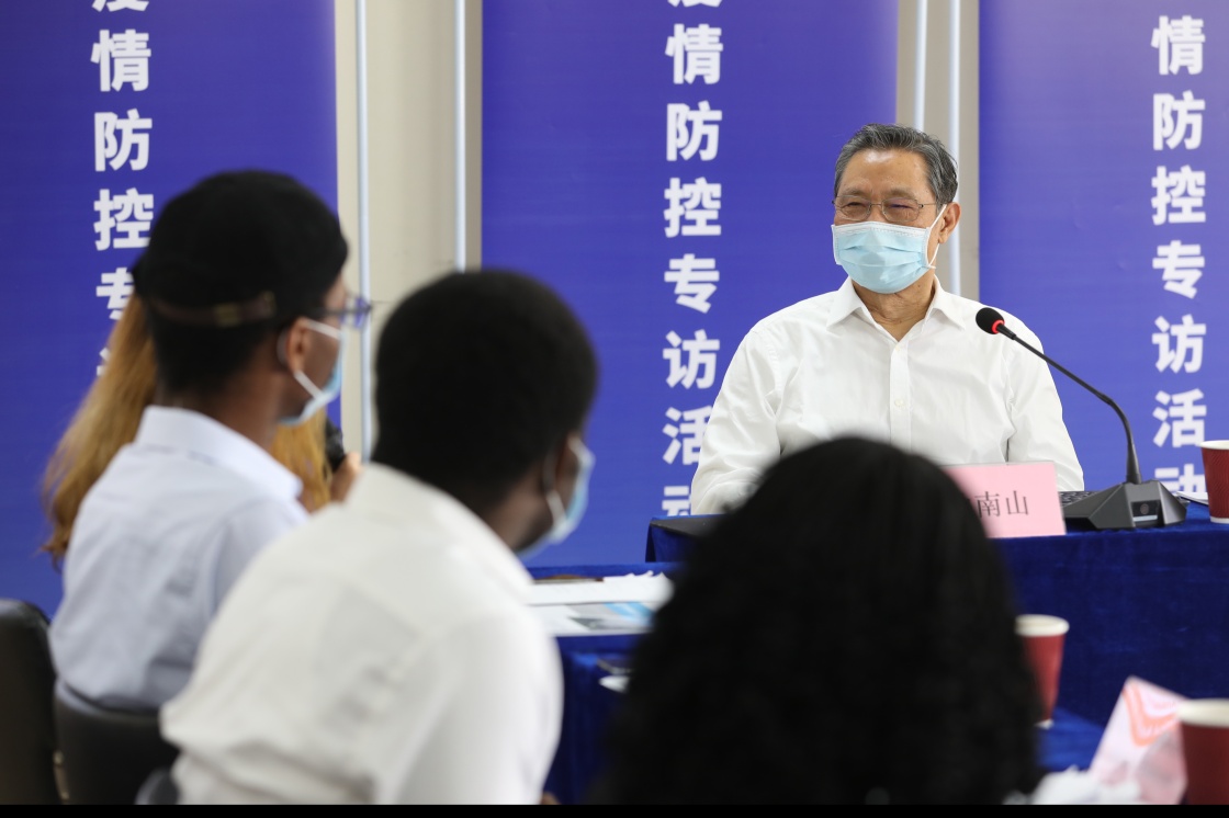 在廣州市第78場疫情防控新聞采訪活動上,中國工程院院士鐘南山與在穗工作學(xué)習(xí)的外籍人士代表進行座談交流(2020年4月15日攝)。新華社記者 李嘉樂 攝