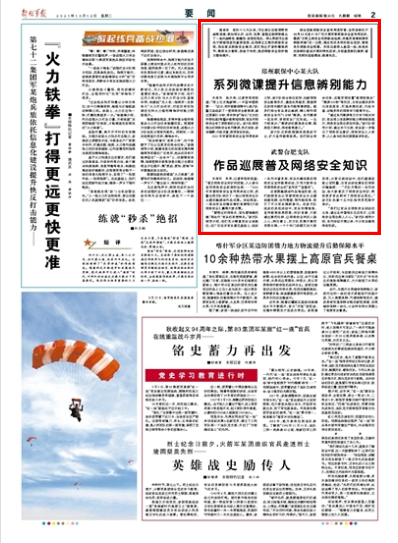 結(jié)合國家網(wǎng)絡(luò)安全宣傳周進(jìn)軍營,全軍各部隊于10月11日至17日廣泛開展軍營網(wǎng)絡(luò)安全宣傳周活動,圍繞“文明上網(wǎng)安全用網(wǎng)依法治網(wǎng),共建共享清朗涉軍網(wǎng)絡(luò)環(huán)境”這一主題,通過形式多樣的配合活動,營造良好網(wǎng)絡(luò)安全氛圍。解放軍報記者深入基層一線,實地采訪各部隊組織開展的特色活動,介紹基層部隊建網(wǎng)、管網(wǎng)、用網(wǎng)的經(jīng)驗做法,敬請關(guān)注。