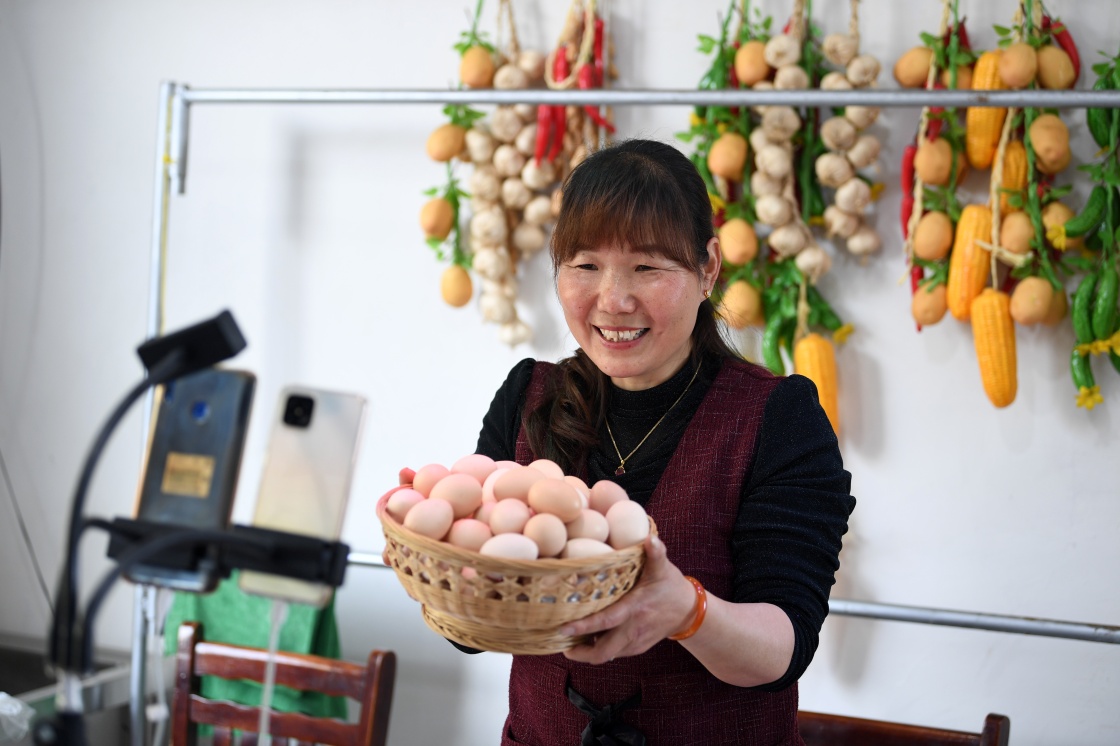 在安徽省六安市舒城縣南港鎮(zhèn)公義村錢元玲的家庭農(nóng)場(chǎng),錢元玲在直播間售賣土雞蛋(2021年3月4日攝)。新華社記者 黃博涵 攝
